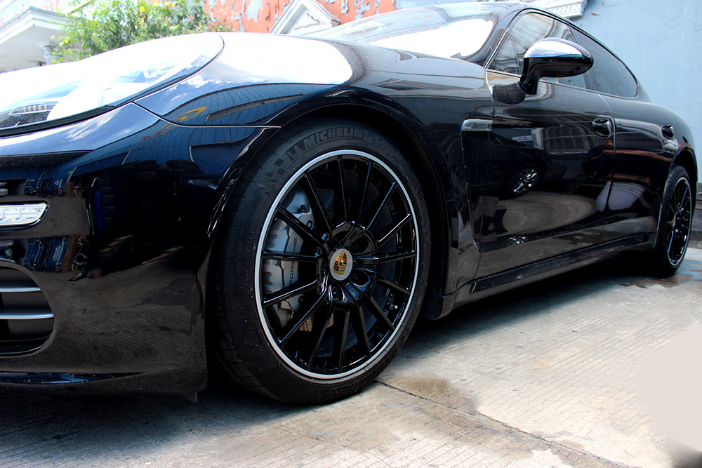 保时捷帕拉梅拉20寸烤漆轮毂改双色亮黑,亮黑色轮毂配银色圈边效果吗?肯定是很棒的,下面我们一起来看一下改色前后效果吧