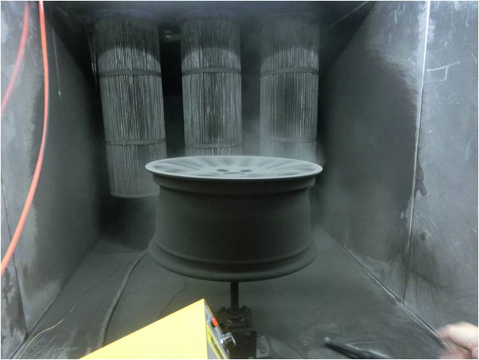 轮毂进行喷面漆,然后在进烘烤做出来硬度能达到2H以上,能够达到轮毂表面无瑕疵的标准