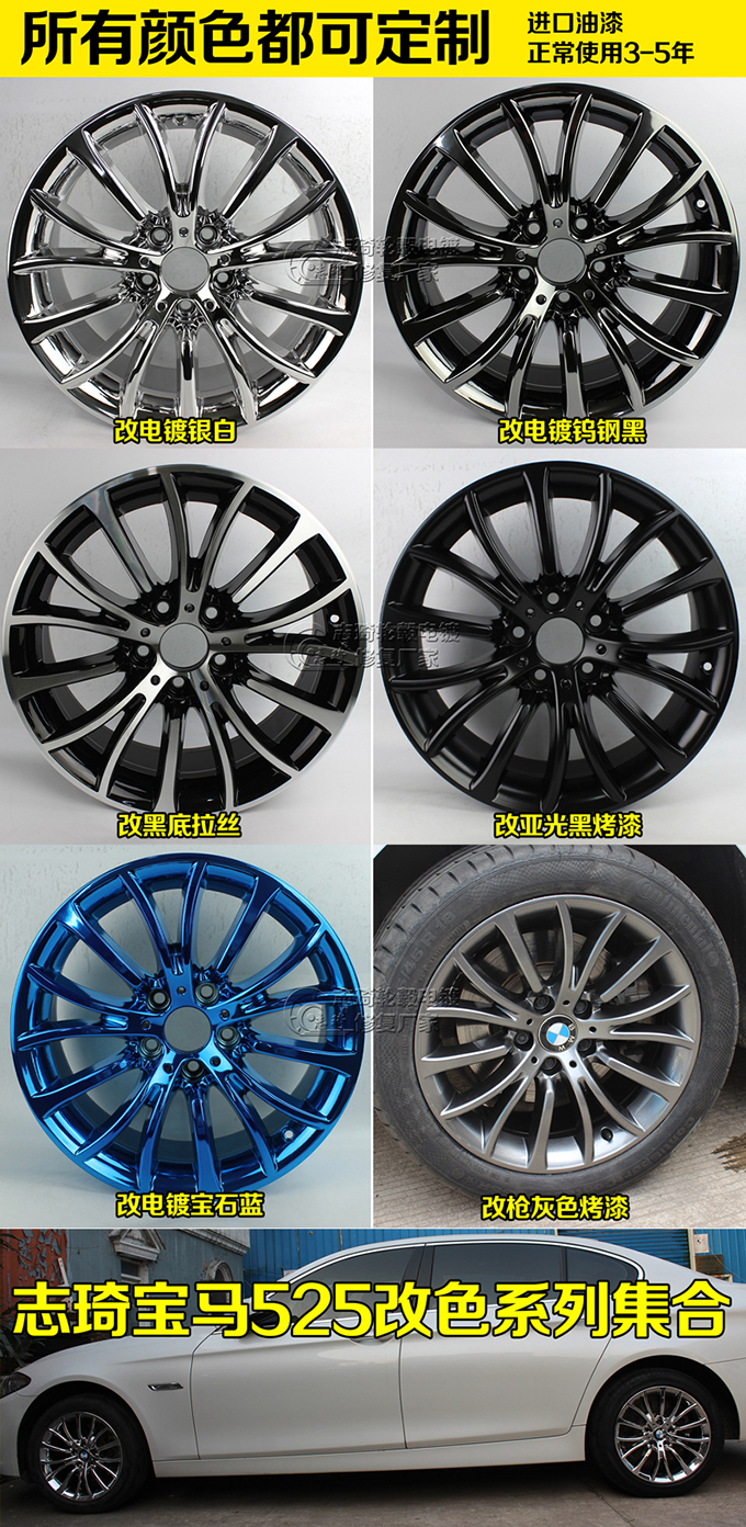 宝马525轮毂改色及电镀的效果图给大家也发了不少,但是就没有综合性一起发个对比的效果,今天给大家看一下宝马525拉丝轮毂改不同工艺不同颜色的效果图。