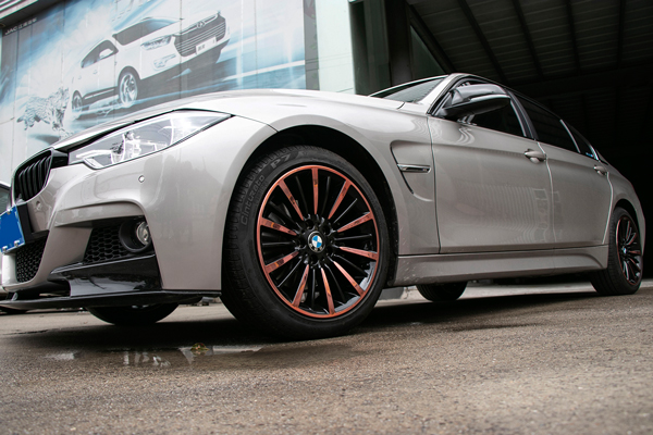 即奔驰gle轮毂改亮黑色烤漆加表面电镀玫瑰金色,宝马也沦陷了。来看看宝马3系414款轮毂改亮黑色烤漆加表面电镀玫瑰金双色的效果展